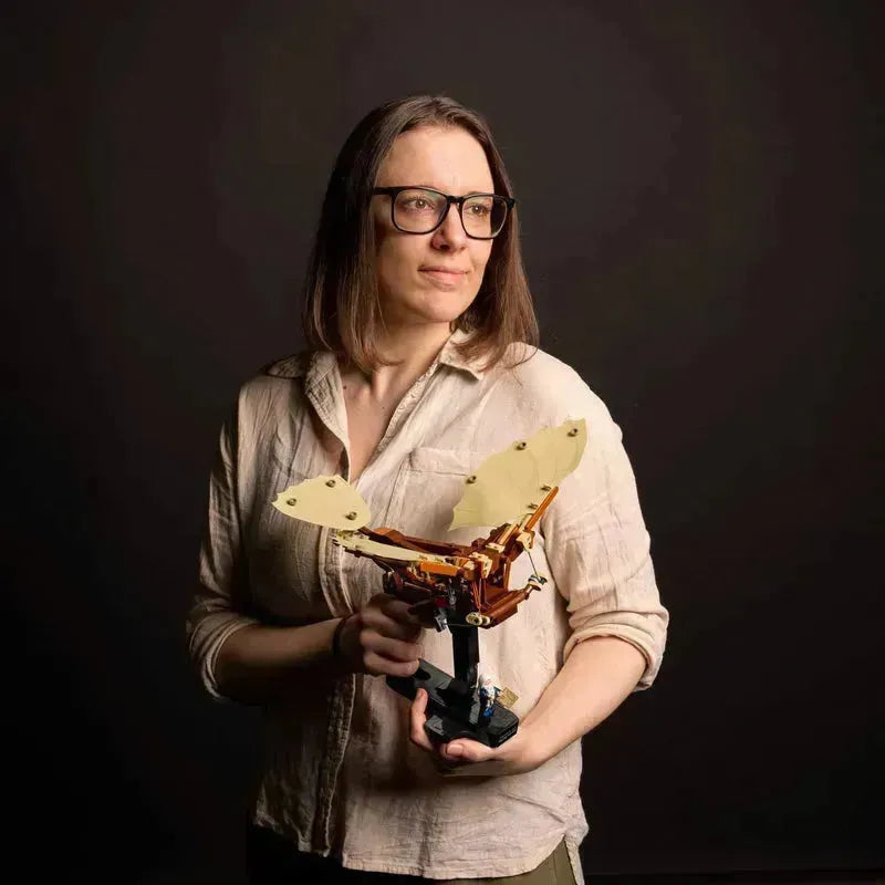 Met LEGO onderdelen kun je stap voor stap Da Vinci's Visionaire ontwerp tot leven brengen. يتم إنشاء آلة الطيران بواسطة آلية لتدفئة الطائرات، ولكن أيضًا في مخططات دافنشي الأصلية. تم تصميم هذا النموذج بمعايير سوداء ومجسم مصغر من ليوناردو دافنشي، مما يعني أنه يمكنك إنشاء أسلوب مختلف من خلال تصميم النماذج.