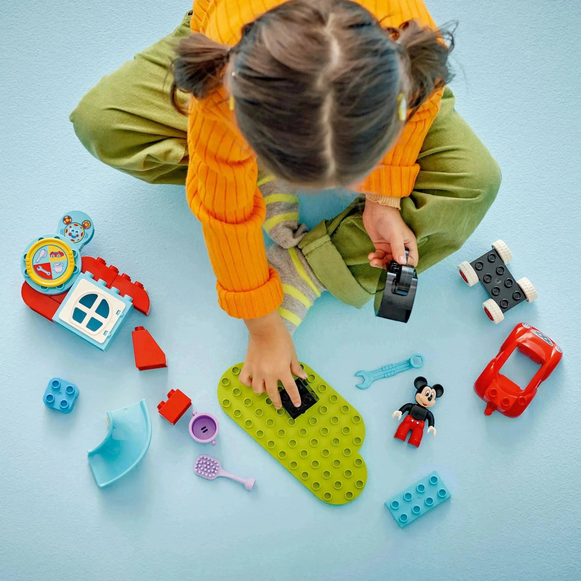 يمكنهم التناوب على تدوير العجلة مع شخص بالغ، ثم استخدام مهاراتهم لمطابقة الصور مع الملحقات الملونة. تتضمن مجموعة لعب المركبات القابلة للبناء هذه مهامًا مثل ضبط السيارة القابلة للبناء باستخدام مفتاح الربط أو تنظيفها باستخدام الدلو والفرشاة. تُنمي الأصابع الصغيرة المهارات الحركية الدقيقة أثناء استكشافهم للميزات الممتعة، بما في ذلك النافذة المفصلية والمنزلق وعجلات السيارة. تُلهم لعبة البناء LEGO® DUPLO® للأطفال الصغار استخدام خيالهم والتعبير عن أنفسهم لابتكار مغامراتهم الخاصة في نادي ميكي ماوس.