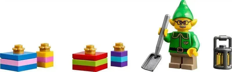 - Kerstman minifiguur: Natuurlijk mag de kerstman zelf niet ontbreken! Hij is gekleed in zijn traditionele rode pak met witte boord en heeft een vrolijk gezicht.