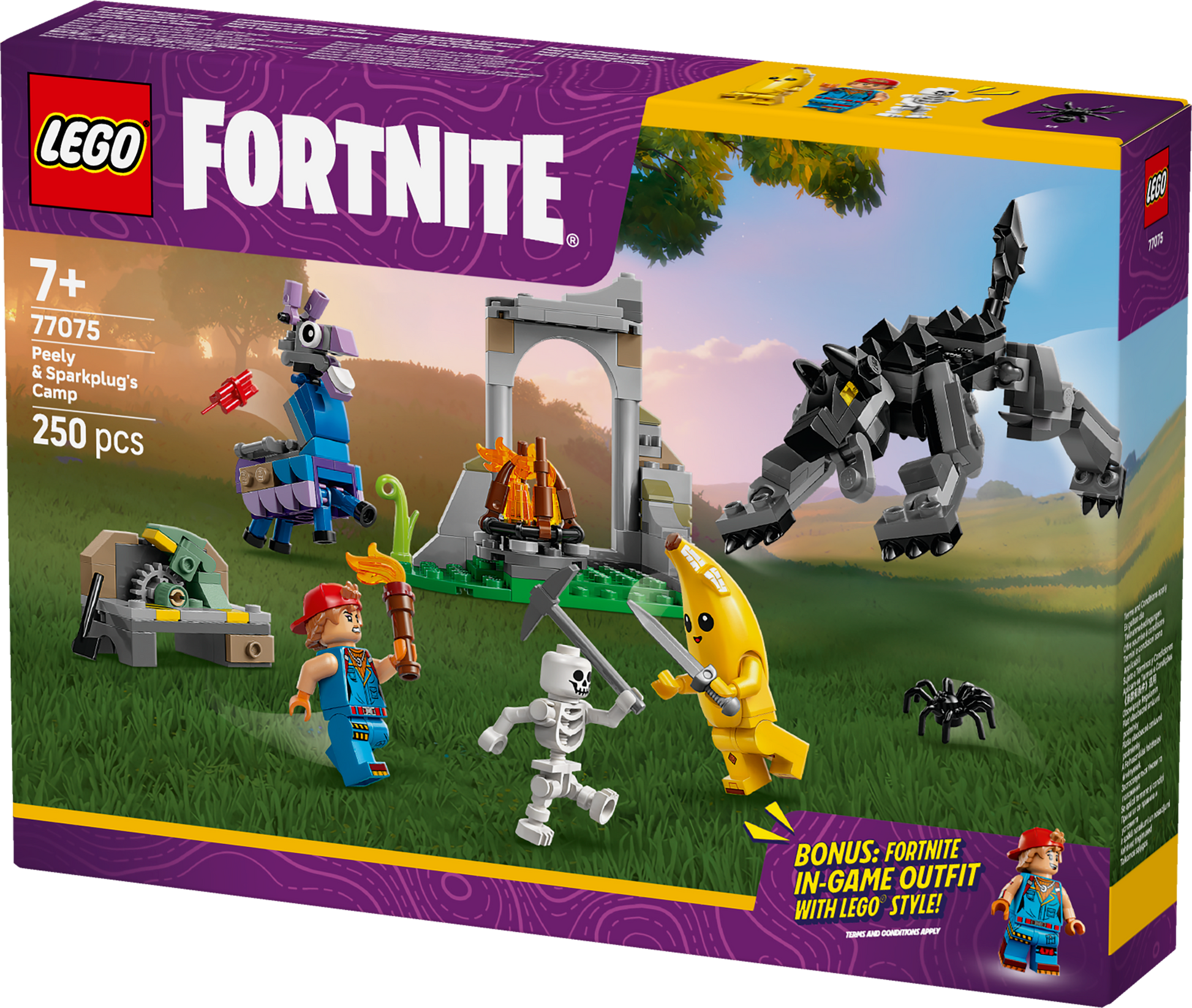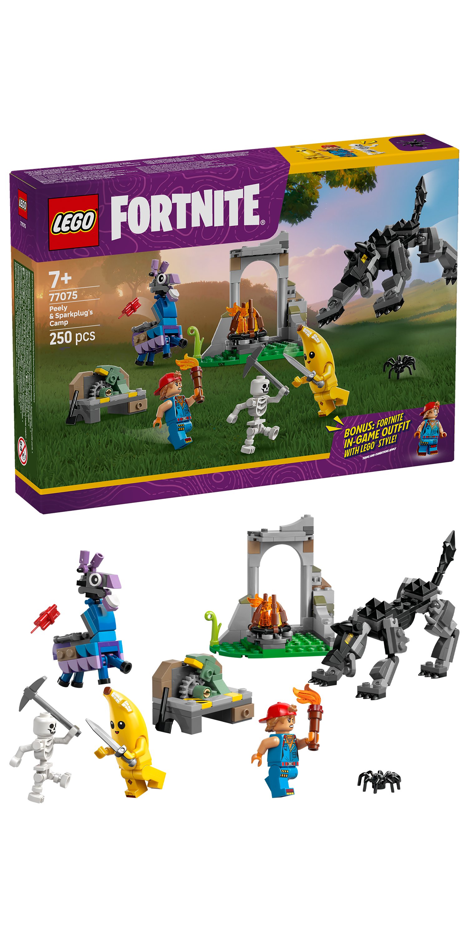 LEGO 77075 Peely's Camp & Sparkplug: Fortnite fun! Jump into the action of Fortnite with the LEGO 77075 Peely's Camp & Sparkplug set. This set brings the popular game to life with buildable locations, characters and vehicles. Perfect for fans of Fortnite and LEGO, this set offers hours of building and play fun.