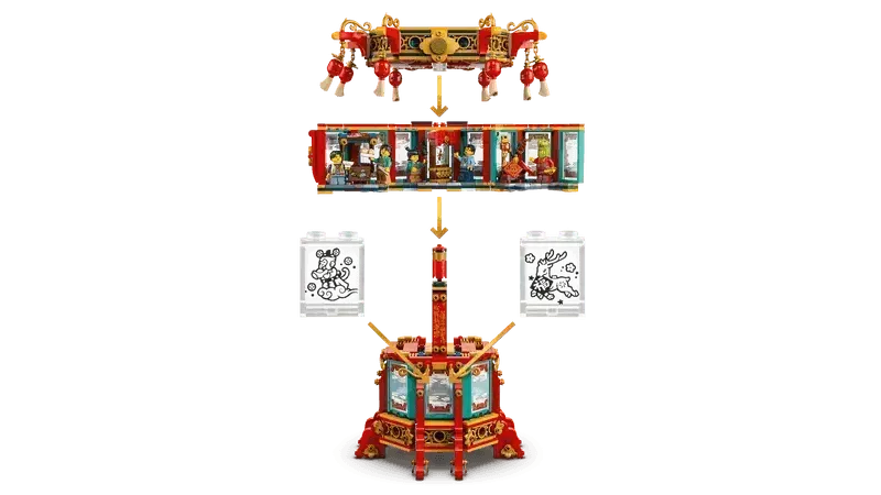 Beyond the main lantern, the set is full of play value: the removable top tier can be folded out to reveal three detailed, festive scenes built at minifigure scale. These scenes depict traditional New Year activities, including a food stall (complete with dumplings), a decoration stall, and a charming shadow theater area. Designed for builders aged 9 and up, this set seamlessly blends an engaging building experience with a beautiful, functional display model that celebrates the cultural richness and communal joy of the Spring Festival. The finished model stands approximately 23 cm (9 in.) high with a diameter of 21 cm (8.2 in.).